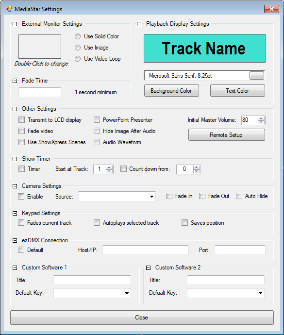 This section will allow you to change the colors for the Playback Window's displays. Simply press the button corresponding to the color that you want to change and the color will be updated to your selection. You can also change the font for the current and next track displays to fit more text.