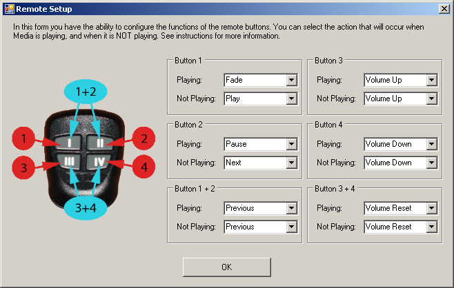 The Remote Setup dialog allows you to configure the functions of the remote buttons. You can select the action that will occur when Media is playing, and when it is NOT playing. Keep in mind that these actions are for BOTH the handheld and ankle remote. Also, when the ankle remote is used with the magnet, it is the same as pressing button 1.